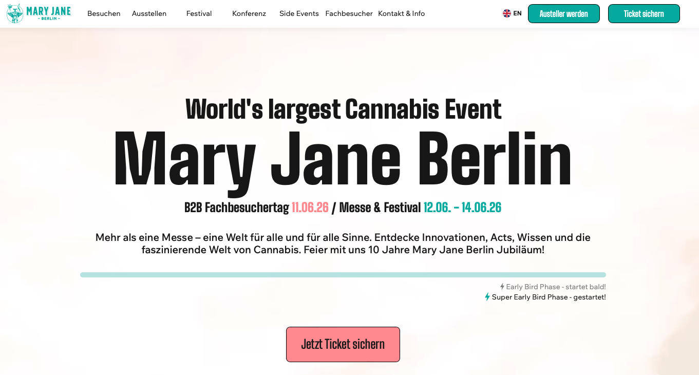 Die Mary Jane Berlin ist heute die größte Cannabis-Messe Europas und eines der bedeutendsten Events der internationalen Cannabisbranche. Sie vereint eine großflächige Fach- und Publikumsmesse mit Festival-Charakter, hochkarätigem B2B-Networking und einem umfangreichen Bühnen- und Konferenzprogramm. Im Mittelpunkt stehen Cannabis-Zubehör, Vaporizer, CBD-Produkte, Lifestyle-Brands, medizinisches Cannabis sowie aktuelle Branchentrends. Mit tausenden Besuchern, internationalen Ausstellern und einem eigenen B2B-Tag ist die Mary Jane Berlin der zentrale europäische Treffpunkt für Marken, Unternehmen, Medien, Creator und die Cannabis-Community.